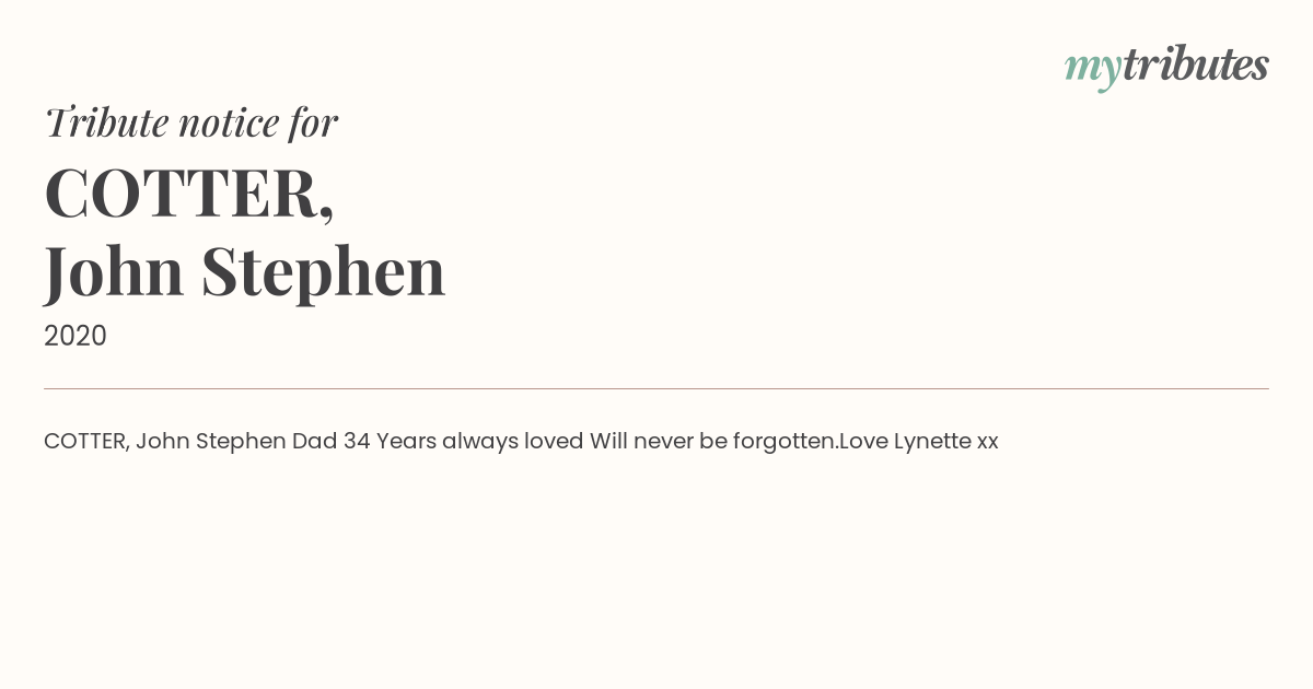 COTTER, John Stephen Dad 34 Years always loved Will never be forgotten.Love Lynette xx