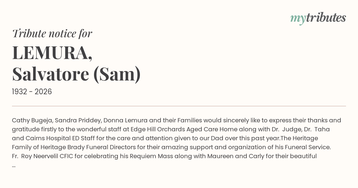 15°CCathy Bugeja, Sandra Priddey, Donna Lemura and their Families would sincerely like to express their thanks and gratitude firstly to the wonderful staff at Edge Hill Orchards Aged Care Home along with Dr. Judge,