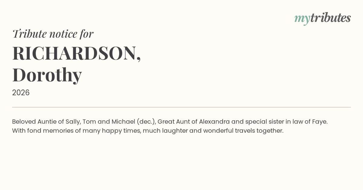 15°CBeloved Auntie of Sally, Tom and Michael (dec.), Great Aunt of Alexandra and special sister in law of Faye. With fond memories of many happy times, much laughter and wonderful travels together.