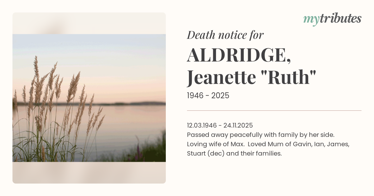 Loving wife of Max. Loved Mum of Gavin, Ian, James, Stuart (dec) and their families.