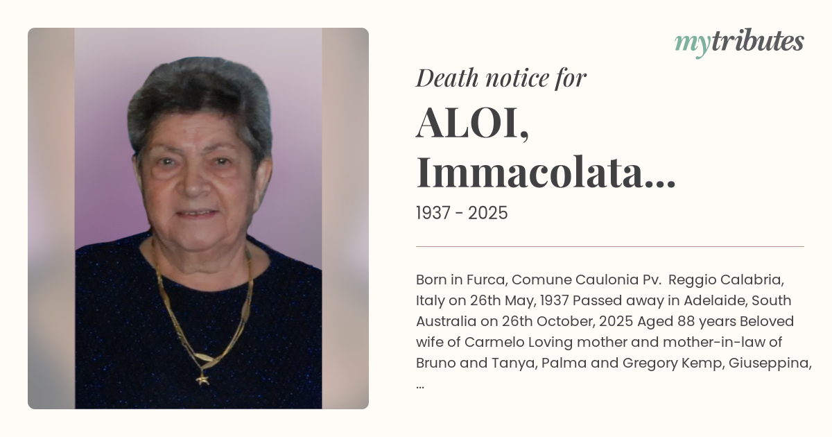 Loved sister-in-law of Immacolata and Angelo Bagnato (both dec) Angelarosa and Nazzareno Tassone (both dec) Antonio and Grazia (Italy) Cosimo and Consiglia (Switzerland) Marianna and Giuseppe Aloi (Italy)
