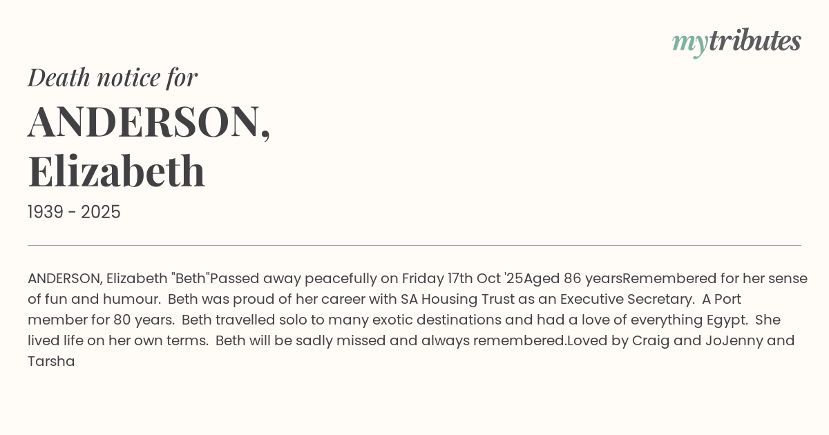 Remembered for her sense of fun and humour. Beth was proud of her career with SA Housing Trust as an Executive Secretary. A Port member for 80 years. Beth travelled solo to many exotic destinations and had a love of everything Egypt. She lived life on her own terms. Beth will be sadly missed and always remembered.