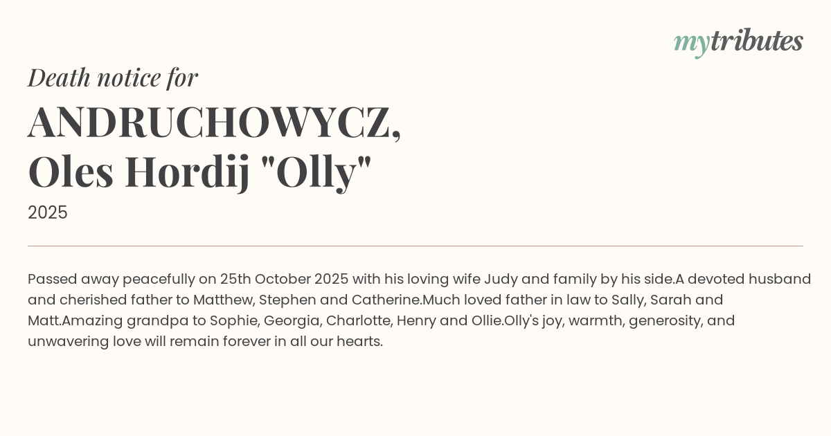 15°CPassed away peacefully on 25th October 2025 with his loving wife Judy and family by his side.
