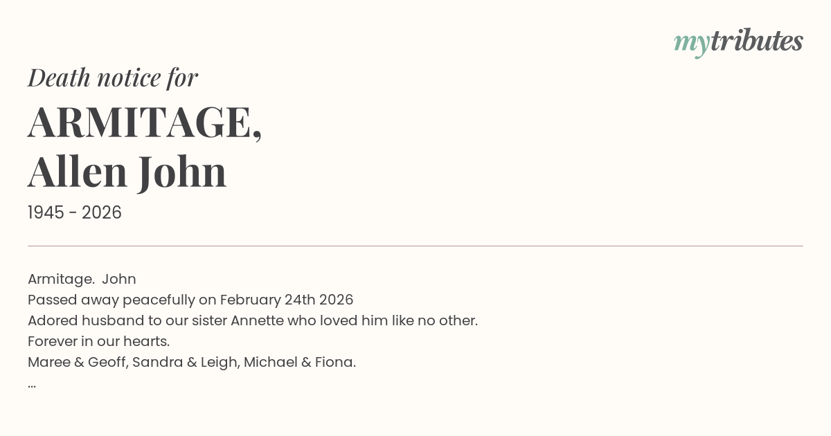 Passed away peacefully on February 24th 2026 Adored husband to our sister Annette who loved him like no other. Forever in our hearts. Maree & Geoff, Sandra & Leigh, Michael & Fiona. Mentor to our children Serra, James, Max, Naomi & Hamish. Grand-mentor to Matisse. Loved & will be deeply missed.