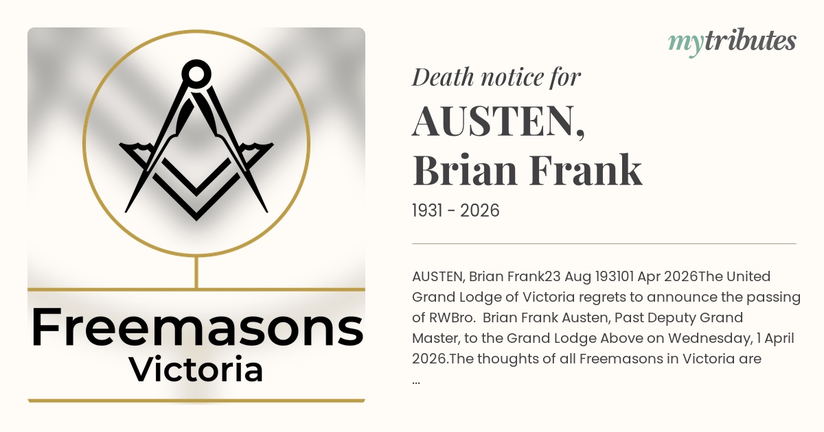 The United Grand Lodge of Victoria regrets to announce the passing of RWBro. Brian Frank Austen, Past Deputy Grand Master, to the Grand Lodge Above on Wednesday, 1 April 2026.