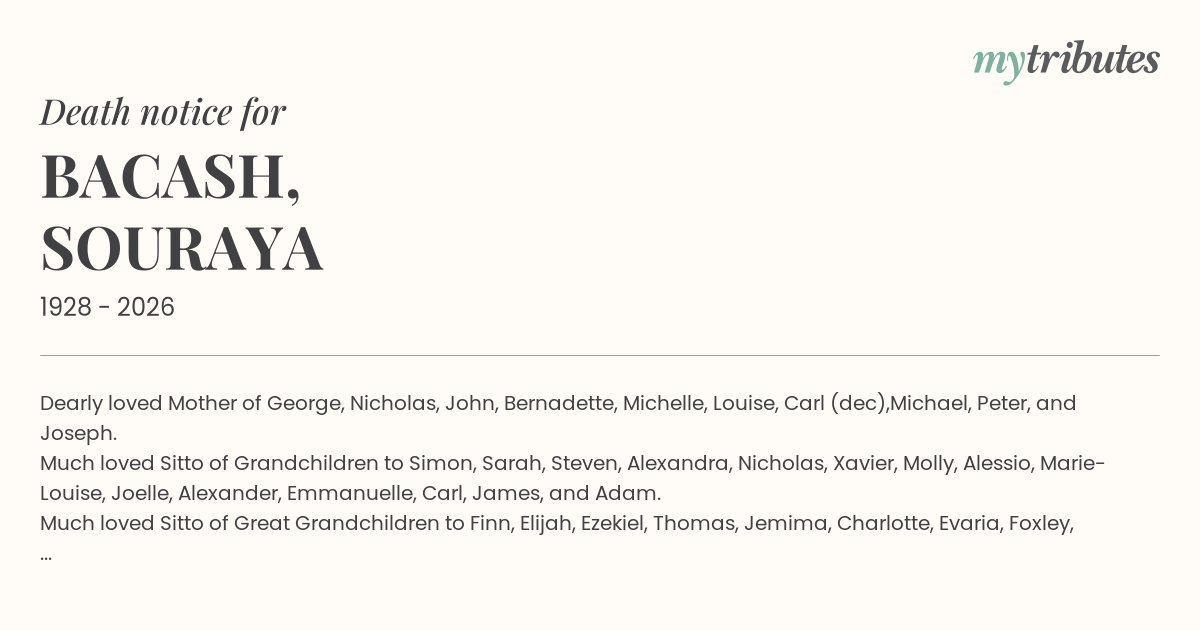 Much loved Sitto of Grandchildren to Simon, Sarah, Steven, Alexandra, Nicholas, Xavier, Molly, Alessio, Marie-Louise, Joelle, Alexander, Emmanuelle, Carl, James, and Adam.