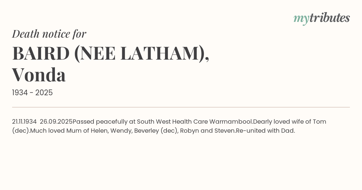 Much loved Mum of Helen, Wendy, Beverley (dec), Robyn and Steven.