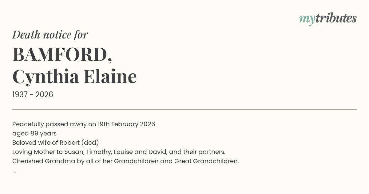 15°CPeacefully passed away on 19th February 2026 aged 89 years Beloved wife of Robert (dcd) Loving Mother to Susan, Timothy, Louise and David, and their partners. Cherished Grandma by all of her Grandchildren and Great Grandchildren. Private Cremation So dearly loved, so sadly missed.