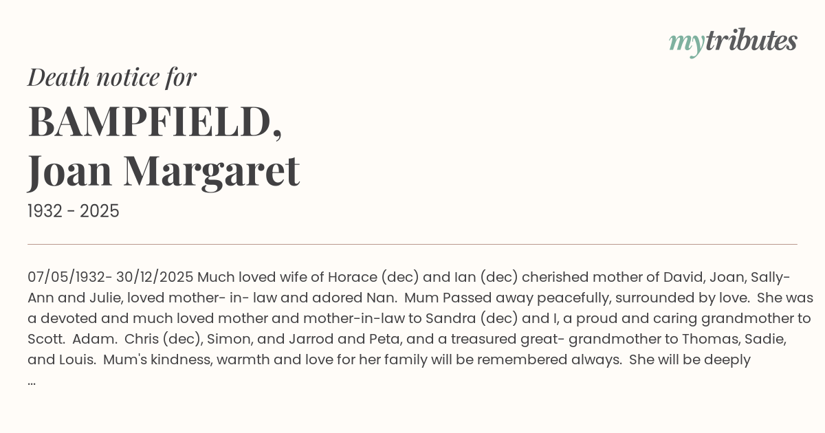 15°C07/05/1932- 30/12/2025 Much loved wife of Horace (dec) and Ian (dec) cherished mother of David, Joan, Sally-Ann and Julie, loved mother- in- law and adored Nan. Mum Passed away peacefully, surrounded by love. She was a devoted and much loved mother and mother-in-law to Sandra (dec) and I, a proud and caring grandmother to Scott. Adam. Chris (dec), Simon, and Jarrod and Peta, and a treasured great- grandmother to Thomas, Sadie, and Louis. Mum's kindness, warmth and love for her family will be remembered always. She will be deeply missed by all who knew her. Peter xx Dear Mum, I already miss you so much it hurts. There are a million things to thank you for, and I am so proud of you. Your compassion, bravery and resilience will continue to inspire me, but nothing will ever fill the void you leave behind. We are eternally grateful for all your teachings, love and support. Sally- Ann, Gary, Floyd and Ebony xx