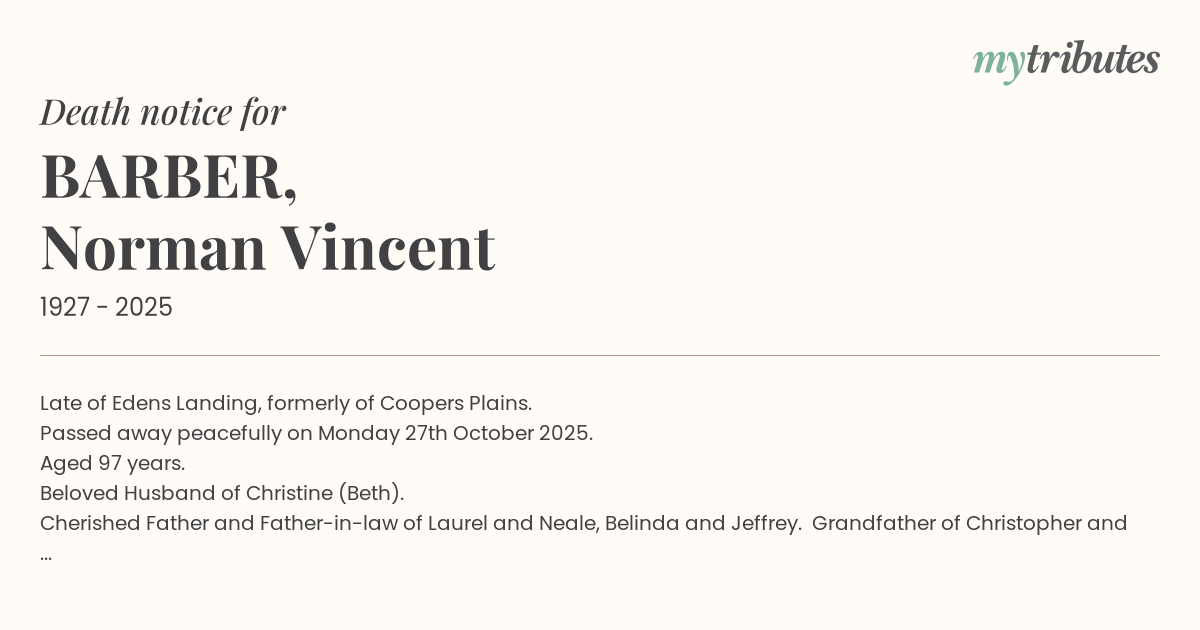 Passed away peacefully on Monday 27th October 2025.