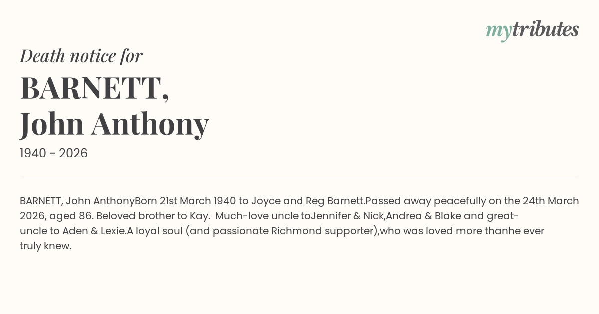 Passed away peacefully on the 24th March 2026, aged 86. Beloved brother to Kay. Much-love uncle to