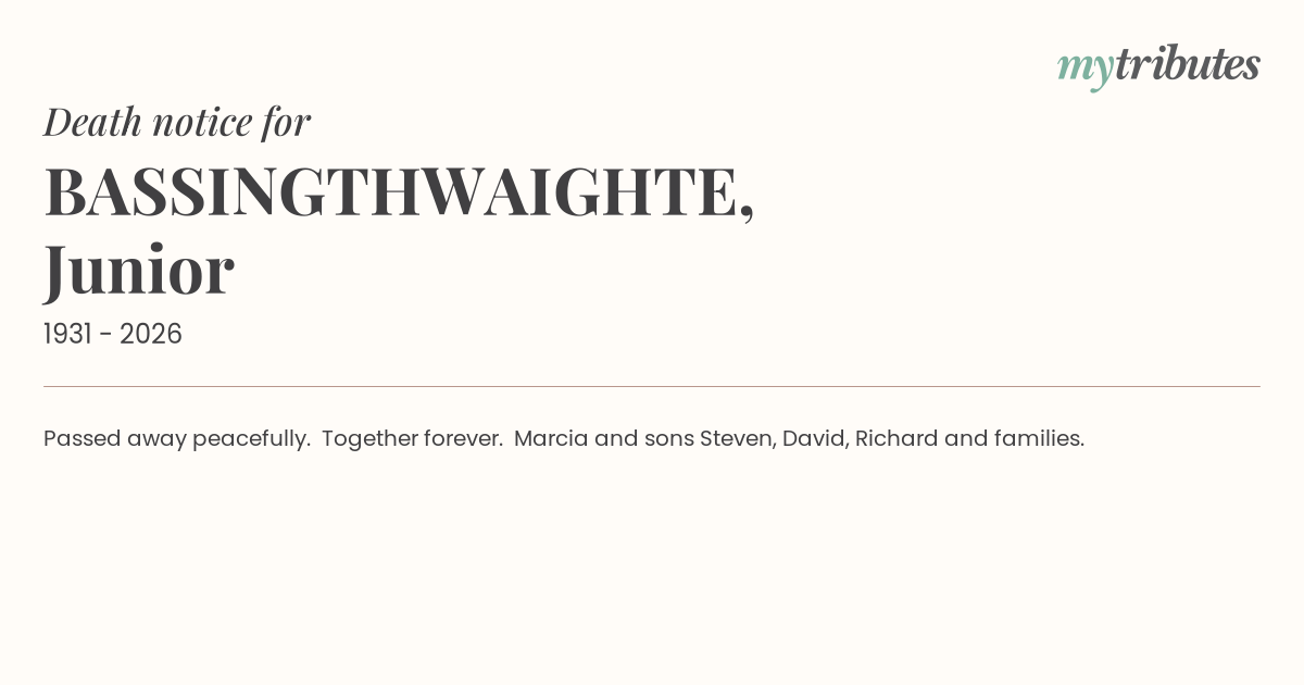 15°CPassed away peacefully. Together forever. Marcia and sons Steven, David, Richard and families.