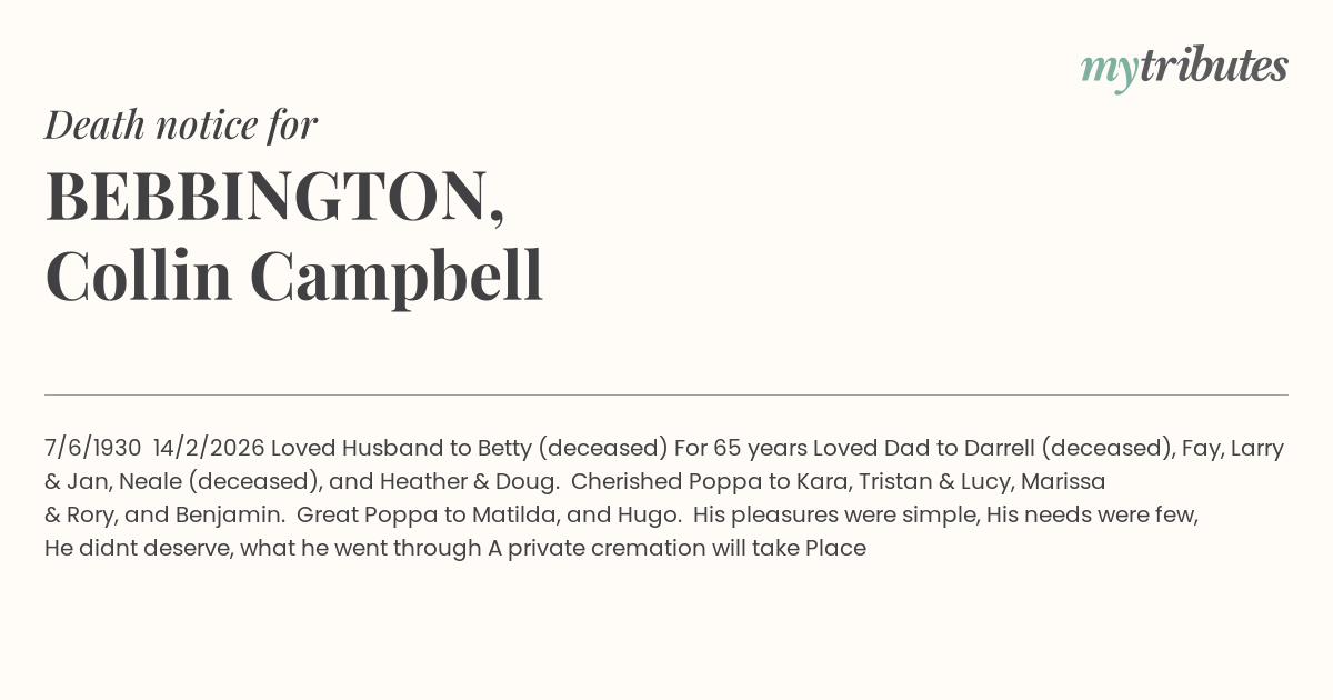 15°C7/6/1930 – 14/2/2026 Loved Husband to Betty (deceased) For 65 years Loved Dad to Darrell (deceased), Fay, Larry & Jan, Neale (deceased), and Heather & Doug. Cherished Poppa to Kara, Tristan & Lucy, Marissa & Rory, and Benjamin. Great Poppa to Matilda, and Hugo. “His pleasures were simple, His needs were few, He didn’t deserve, what he went through” A private cremation will take Place