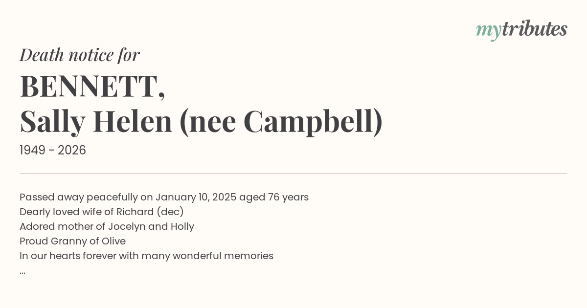 15°CPassed away peacefully on January 10, 2025 aged 76 years