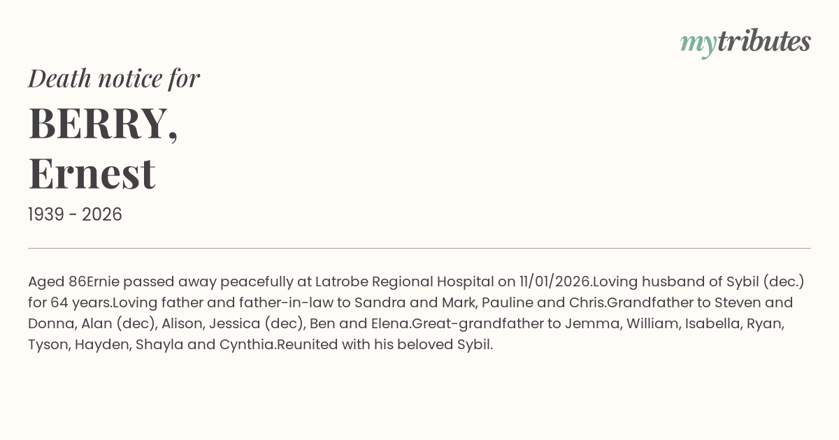 Ernie passed away peacefully at Latrobe Regional Hospital on 11/01/2026.