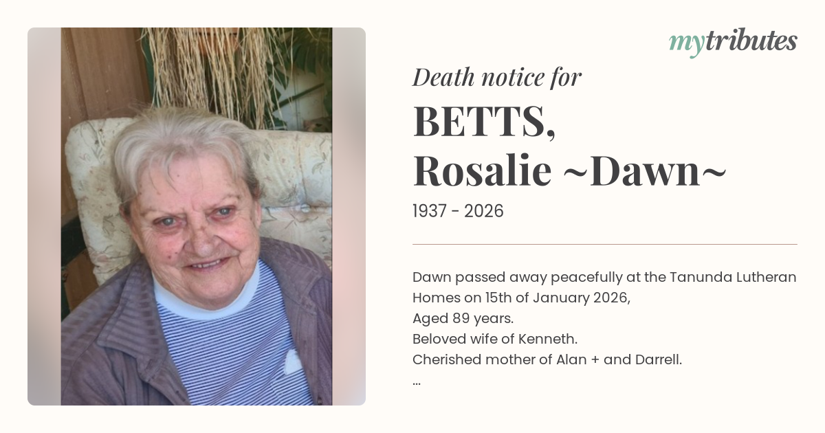 15°CDawn passed away peacefully at the Tanunda Lutheran Homes on 15th of January 2026,
