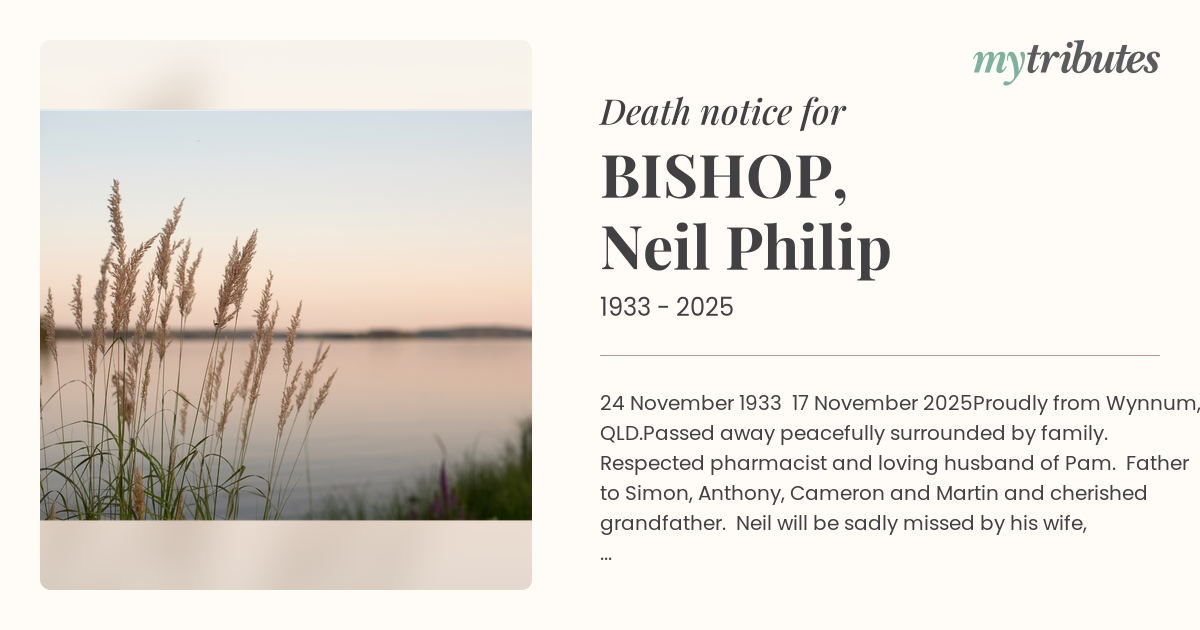 Passed away peacefully surrounded by family. Respected pharmacist and loving husband of Pam. Father to Simon, Anthony, Cameron and Martin and cherished grandfather. Neil will be sadly missed by his wife, family and dear friends.