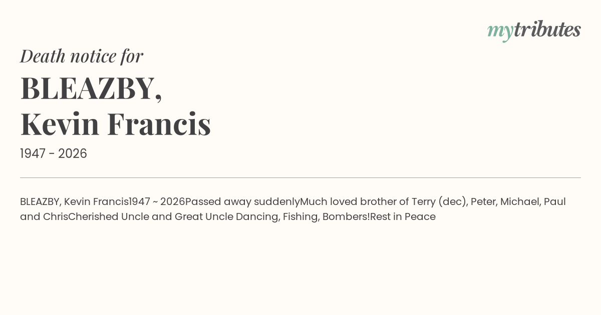 Much loved brother of Terry (dec), Peter, Michael, Paul and Chris