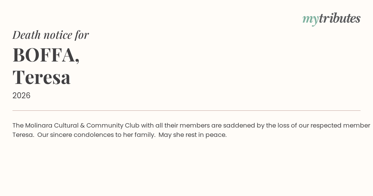 15°CThe Molinara Cultural & Community Club with all their members are saddened by the loss of our respected member Teresa. Our sincere condolences to her family. May she rest in peace.