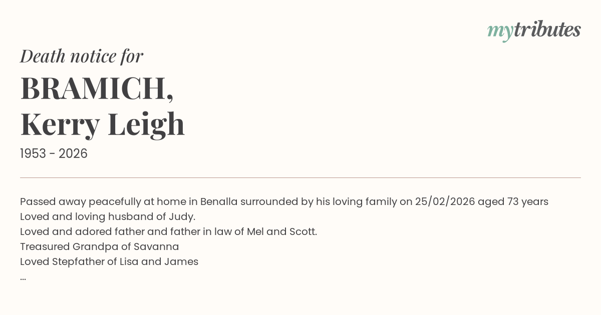 15°CPassed away peacefully at home in Benalla surrounded by his loving family on 25/02/2026 aged 73 years