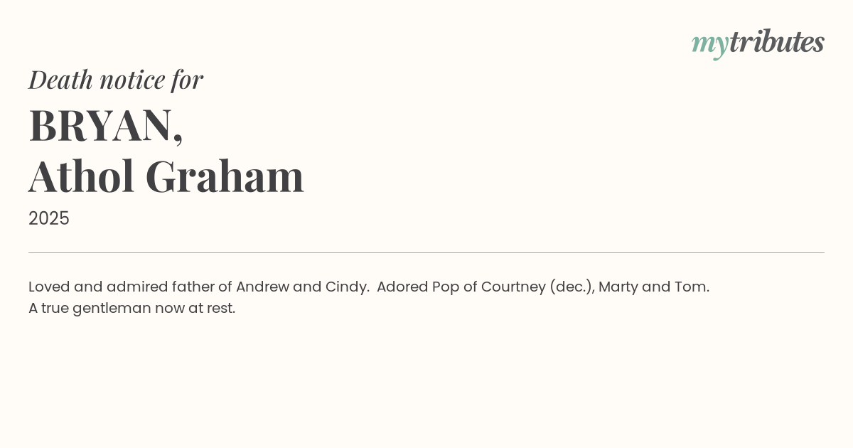 15°CLoved and admired father of Andrew and Cindy. Adored Pop of Courtney (dec.), Marty and Tom.
