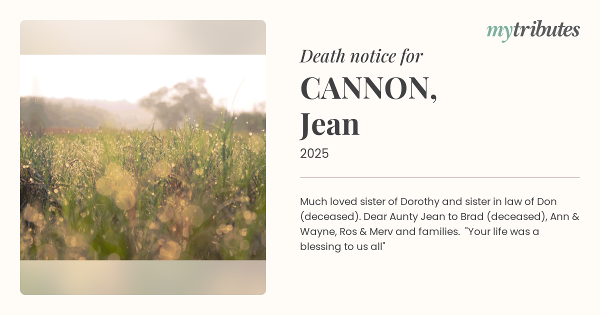 15°CMuch loved sister of Dorothy and sister in law of Don (deceased). Dear Aunty Jean to Brad (deceased), Ann & Wayne, Ros & Merv and families. "Your life was a blessing to us all"