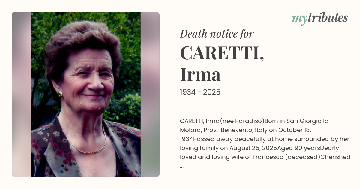 Loved daughter-in-law of Luigi and Filomena Caretti (both deceased in Italy)
