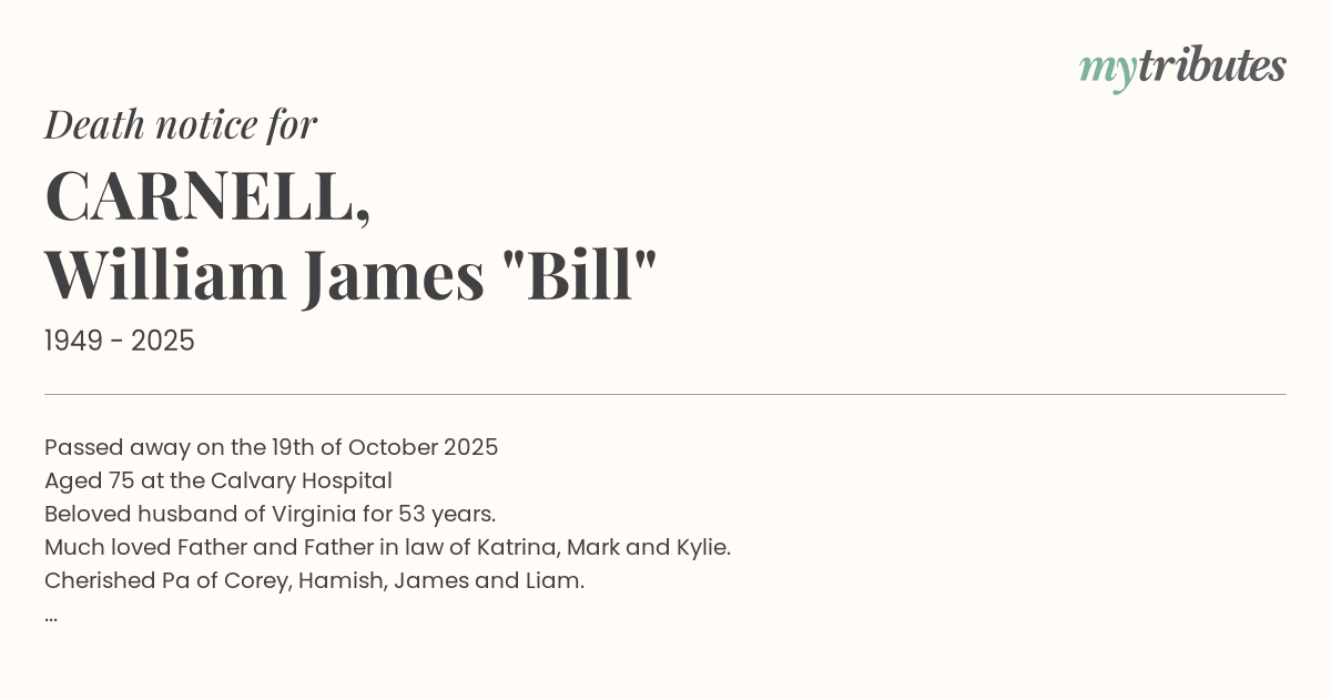 15°CPassed away on the 19th of October 2025 Aged 75 at the Calvary Hospital Beloved husband of Virginia for 53 years. Much loved Father and Father in law of Katrina, Mark and Kylie. Cherished Pa of Corey, Hamish, James and Liam. Loved Great Pa of Carter and Baby Girl