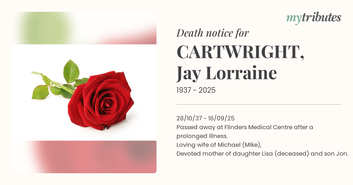 Passed away at Flinders Medical Centre after a prolonged illness.