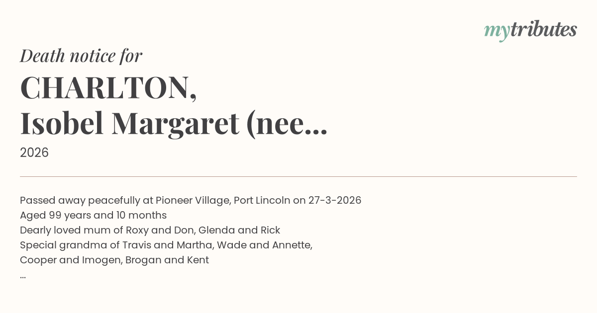 15°CPassed away peacefully at Pioneer Village, Port Lincoln on 27-3-2026