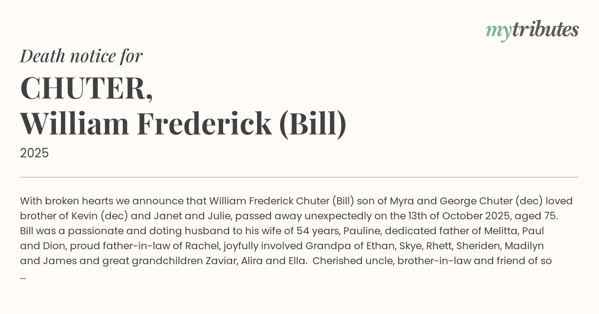 15°CWith broken hearts we announce that William Frederick Chuter (Bill) son of Myra and George Chuter (dec) loved brother of Kevin (dec) and Janet and Julie, passed away unexpectedly on the 13th of October 2025, aged 75.