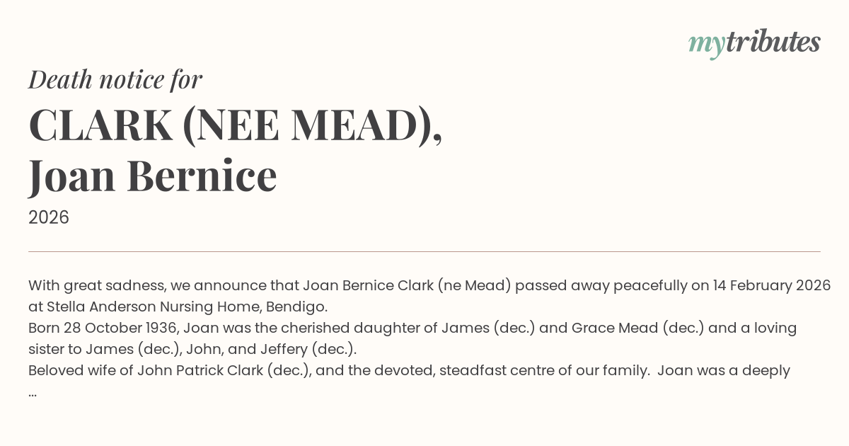 15°CWith great sadness, we announce that Joan Bernice Clark (née Mead) passed away peacefully on 14 February 2026 at Stella Anderson Nursing Home, Bendigo.
