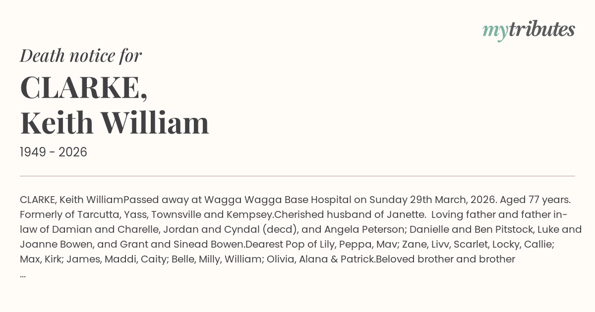 Passed away at Wagga Wagga Base Hospital on Sunday 29th March, 2026. Aged 77 years. Formerly of Tarcutta, Yass, Townsville and Kempsey.