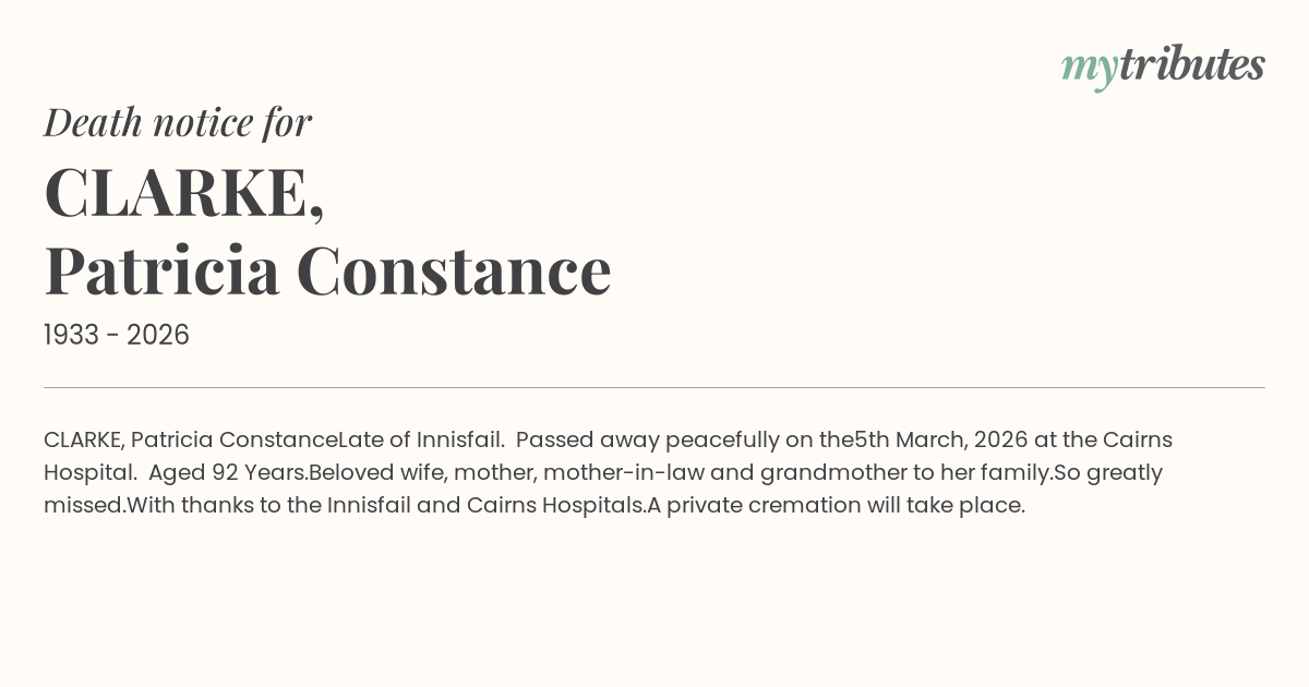 5th March, 2026 at the Cairns Hospital. Aged 92 Years.