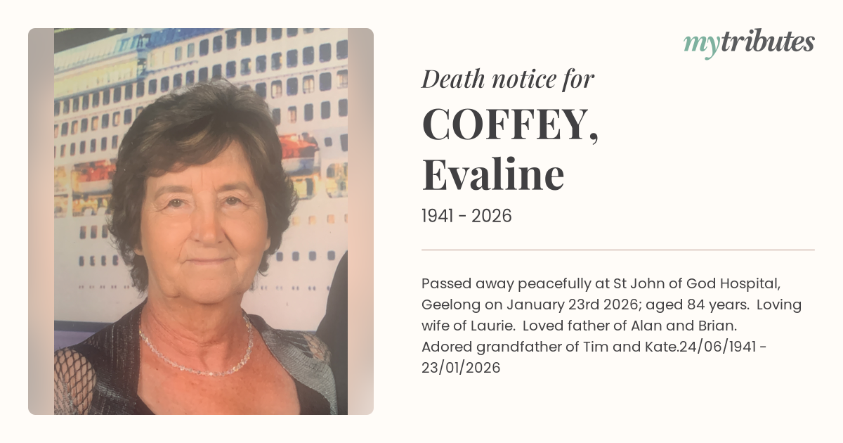15°CPassed away peacefully at St John of God Hospital, Geelong on January 23rd 2026; aged 84 years.