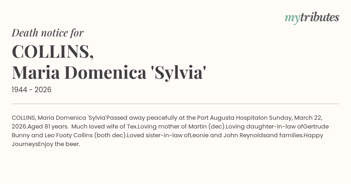 15°CCOLLINS, Maria Domenica 'Sylvia'
