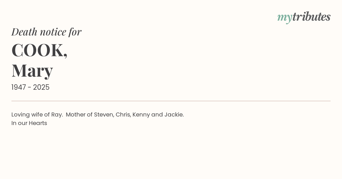 15°CLoving wife of Ray. Mother of Steven, Chris, Kenny and Jackie.