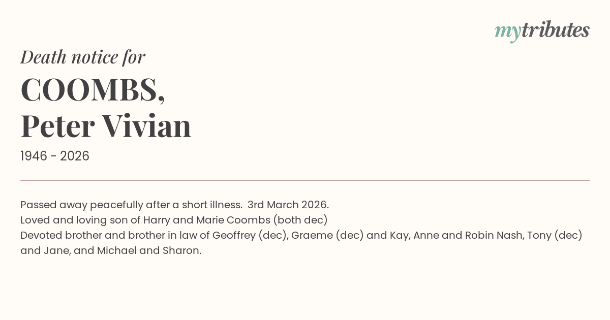 Loved and loving son of Harry and Marie Coombs (both dec)