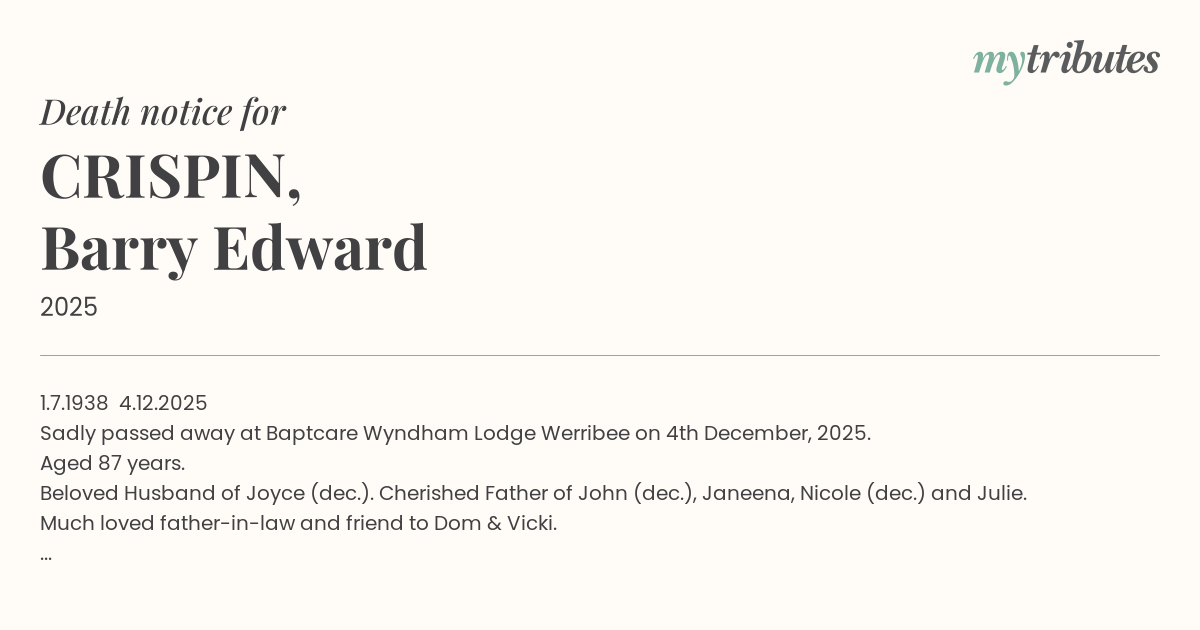 Sadly passed away at Baptcare Wyndham Lodge Werribee on 4th December, 2025.