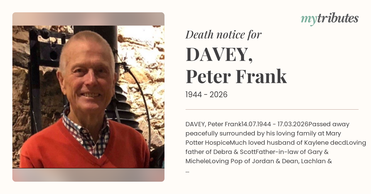 Passed away peacefully surrounded by his loving family at Mary Potter Hospice
