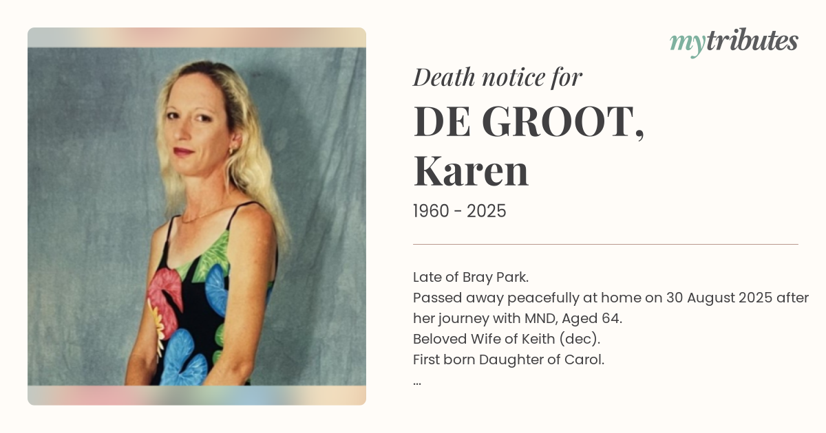 Passed away peacefully at home on 30 August 2025 after her journey with MND, Aged 64.