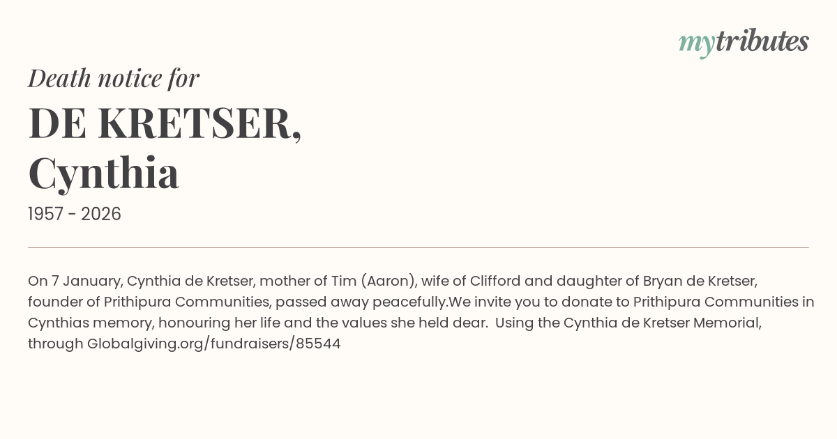 15°COn 7 January, Cynthia de Kretser, mother of Tim (Aaron), wife of Clifford and daughter of Bryan de Kretser, founder of Prithipura Communities, passed away peacefully.