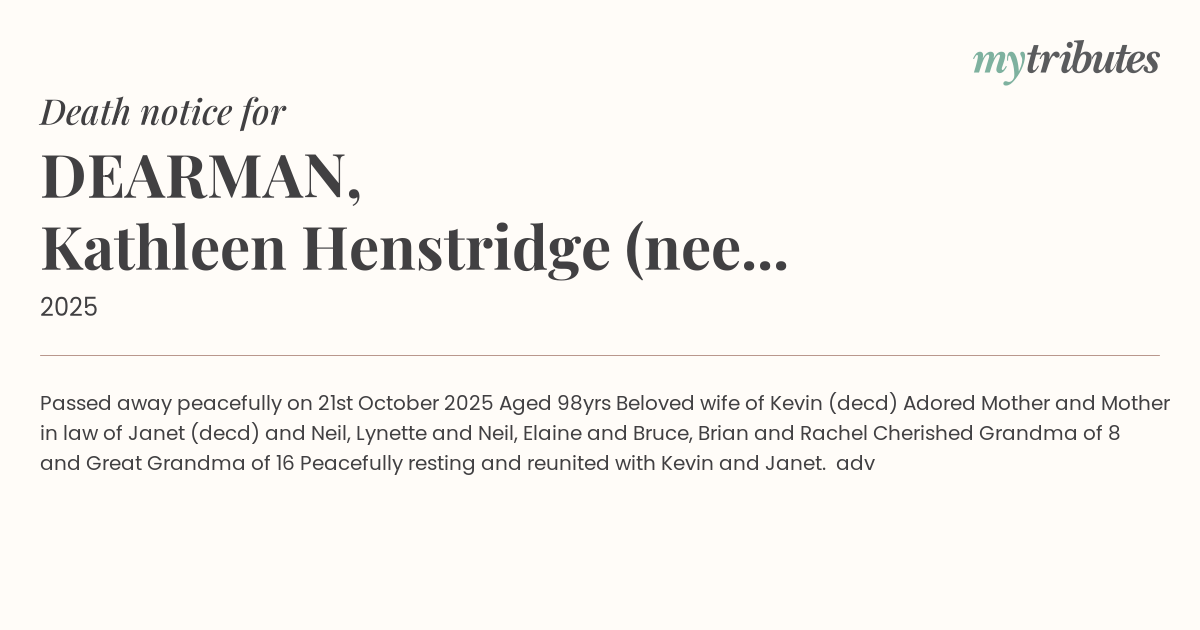 15°CPassed away peacefully on 21st October 2025 Aged 98yrs Beloved wife of Kevin (dec’d) Adored Mother and Mother in law of Janet (dec’d) and Neil, Lynette and Neil, Elaine and Bruce, Brian and Rachel Cherished Grandma of 8 and Great Grandma of 16 Peacefully resting and reunited with Kevin and Janet. adv