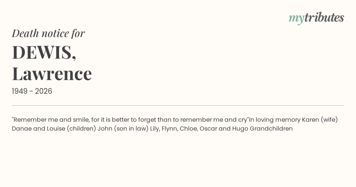 In loving memory Karen (wife) Danae and Louise (children) John (son in law) Lily, Flynn, Chloe, Oscar and Hugo Grandchildren