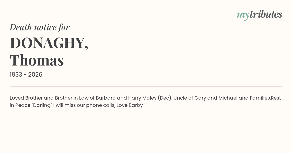 15°CLoved Brother and Brother in Law of Barbara and Harry Males (Dec). Uncle of Gary and Michael and Families.