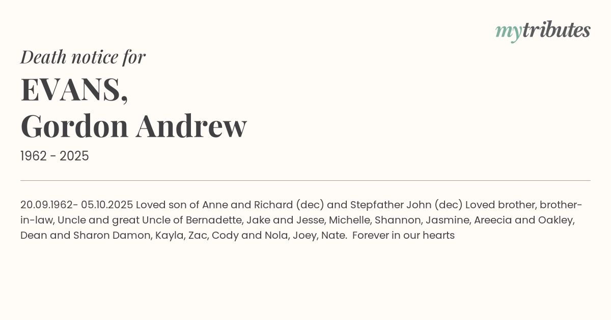 Loved son of Anne and Richard (dec) and Stepfather John (dec)