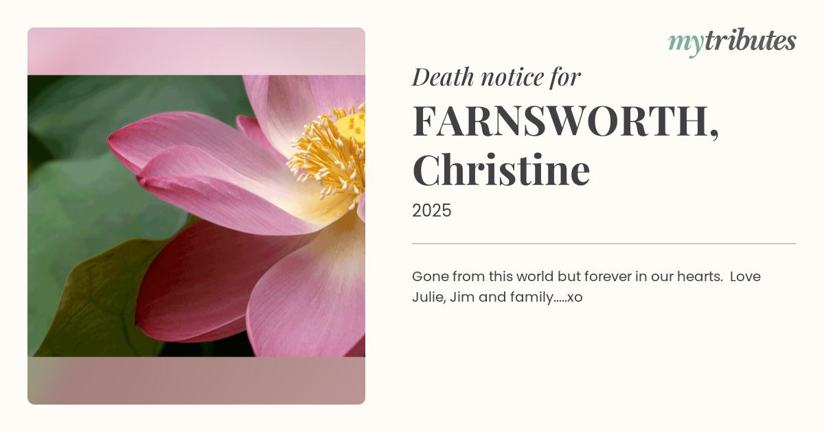 Gone from this world but forever in our hearts. Love Julie, Jim and family.....xo