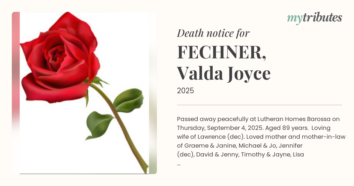 15°CPassed away peacefully at Lutheran Homes Barossa on Thursday, September 4, 2025. Aged 89 years. Loving wife of Lawrence (dec). Loved mother and mother-in-law of Graeme & Janine, Michael & Jo, Jennifer (dec), David & Jenny, Timothy & Jayne, Lisa (dec) and a loving grandmother to Amanda & Megan, Huon, Dana, Claudia, Clayton & Melany, Joshua & Jayden, Thomas & Cassie, Alex & partners. A great grandmother to Emily, Pippa, Charlotte, Frederick, Walter, Lawrence & Ivy. You will never be forgotten and will remain in our hearts forever. Please refer to The Leader for funeral announcement.