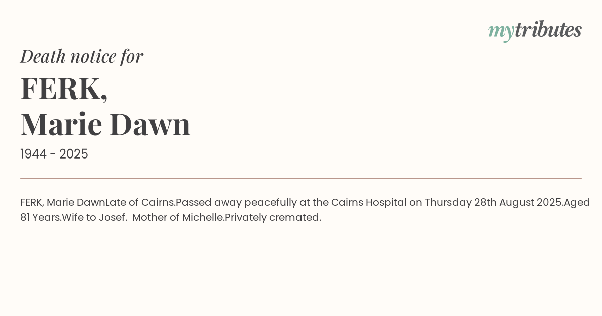 Passed away peacefully at the Cairns Hospital on Thursday 28th August 2025.