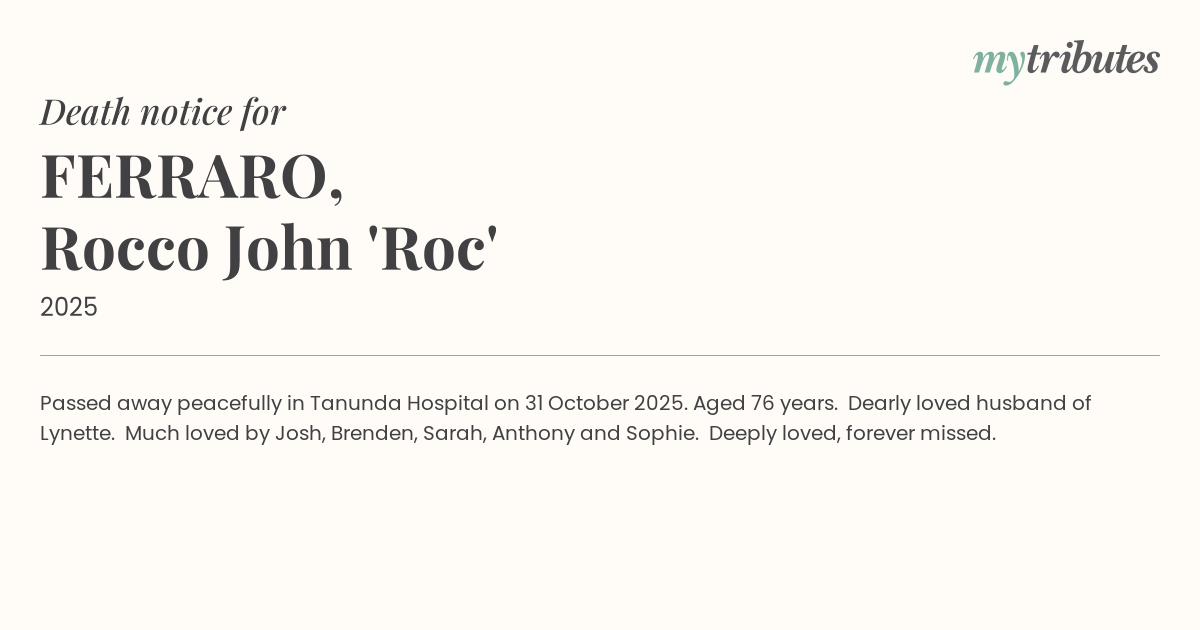 15°CPassed away peacefully in Tanunda Hospital on 31 October 2025.